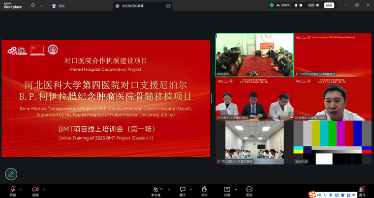 12月18日,我院与尼泊尔B.P.柯伊拉腊纪念肿瘤医院共同举办骨髓移植项目首次线上培训会采用全英文方式交流。作为中尼骨髓移植(BMT)培训项目2025年度计划的重要环节,会议聚焦血液内科、核医学科、放疗科等骨髓移植相关学科,通过云端平台实现了高效、直接的国际专业对话,有力推动了中尼双方在骨髓移植技术领域的知识共享与能力提升。